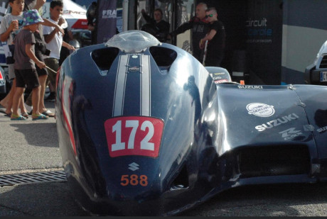 Le châssis de ce sidecar de vitesse est un SGR de 2017, de fabrication francaise. C'est un chassis court, également désigné de type F2. Le moteur est situé devant le pilote ; celui de notre sidecar est un 600 GSXR, moteur réputé et avéré fiable et robuste.
